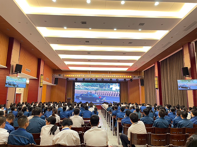 9月3日上午,万洲电气一楼多功能厅气氛庄重而热烈,万洲集团400余名在家员工齐聚一堂,集中观看中国人民抗日战争暨世界反法西斯战争胜利80周年现场直播。