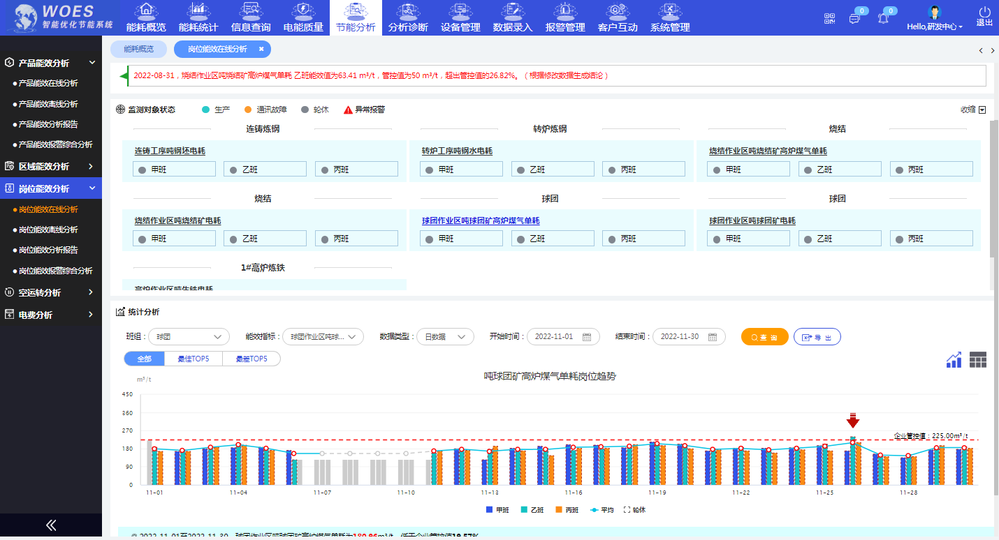 4、班组能效管控考核,提高生产效率、能源使用效率。通过实时查看每月每日每个班组的产量、能耗和单耗情况,系统自动开展能效诊断分析,发现各生产班组的能耗差异。针对各生产工序(石灰窑、烧结、球团、喷煤、高炉、热风炉、转炉、连铸、加热炉、轧钢)规分别建立班组能效评价考核体系,范员工操作,提高员工节能意识,实现年节约收益120万元。