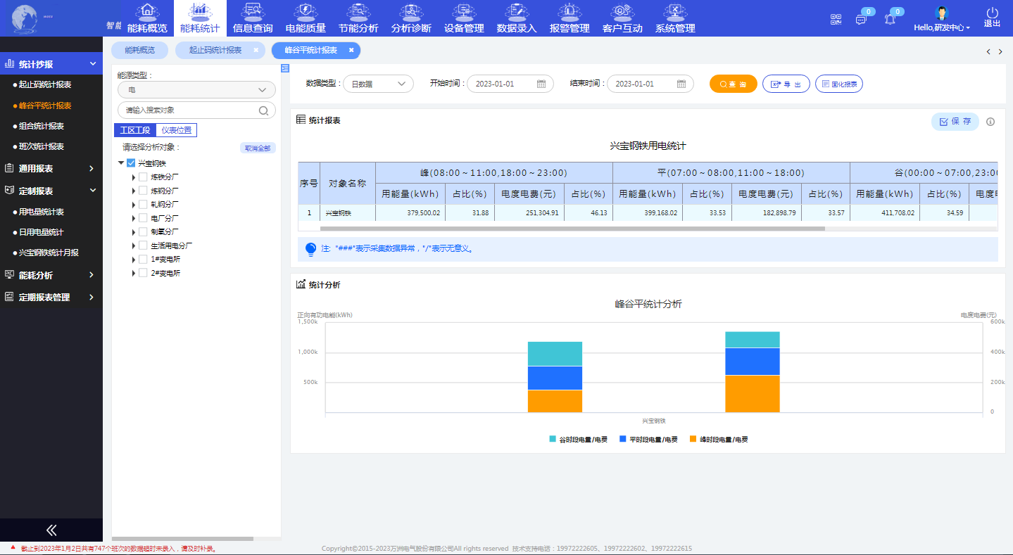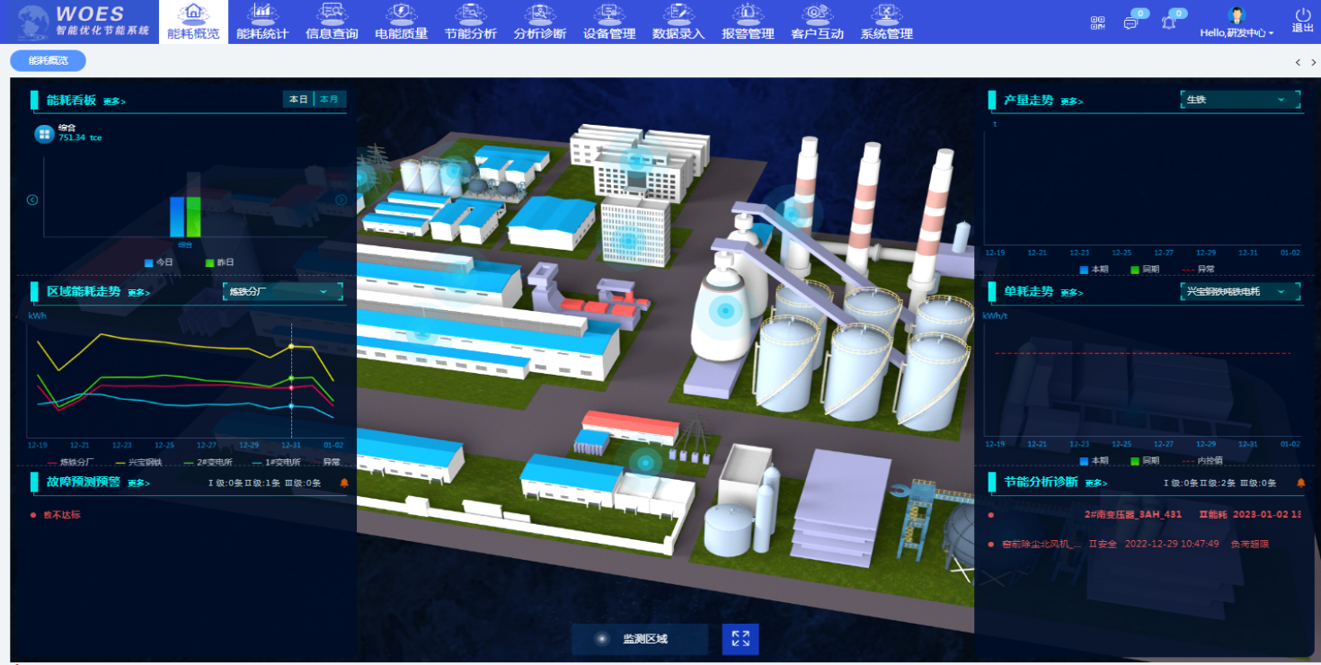 2、提升产品单耗分析能力。通过各种趋势图、曲线图等统计、分析功能对铁水、钢坯、锻件、钢管进行单耗分析(将当前能源消耗的指标数据与企业管控值、行业先进值进行对标),根据不同时间(白班和夜班、夏季和冬季)的单耗可以分析出区域能耗异常的时间,从而查找原因制定措施针对性解决。