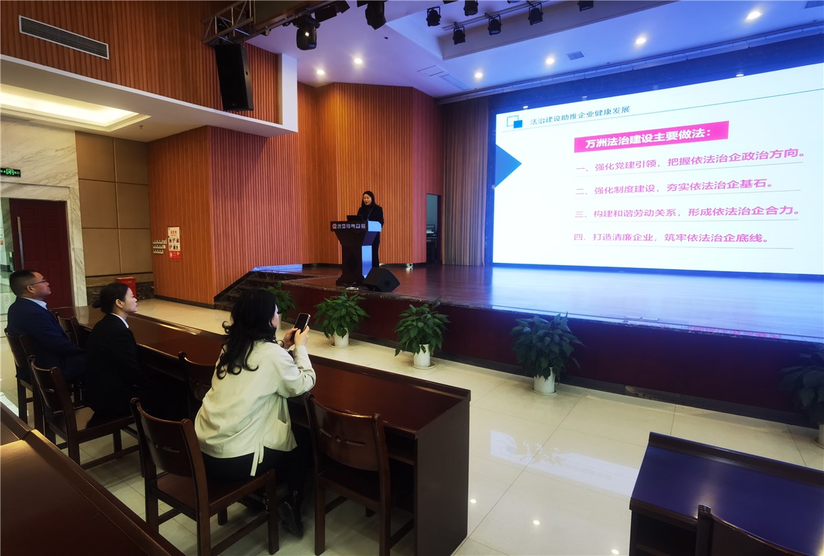 陈部长一行先后参观了万洲电气文化展示厅、WOES智能优化节能系统测试试验演示中心和法治宣传阵地。在一楼多功能厅,万洲电气工会主席、行政部经理熊海娟从“强化党建引领”、“强化制度建设”、“重视构建和谐劳动关系”、“打造清廉企业示范点”四个方面,详细汇报了万洲电气“推进法治建设、助力企业发展”的具体做法。“三推、三个出来”特色党建、“小节不保、大节必失”的廉洁自律准则、常态化开展法治宣传教育、建立多层次民主协商机制、创建清廉b体育官网等法治建设工作得到陈部长一行的高度认可,并称赞万洲电气法治建设有载体、有深度、很成效,值得学习。