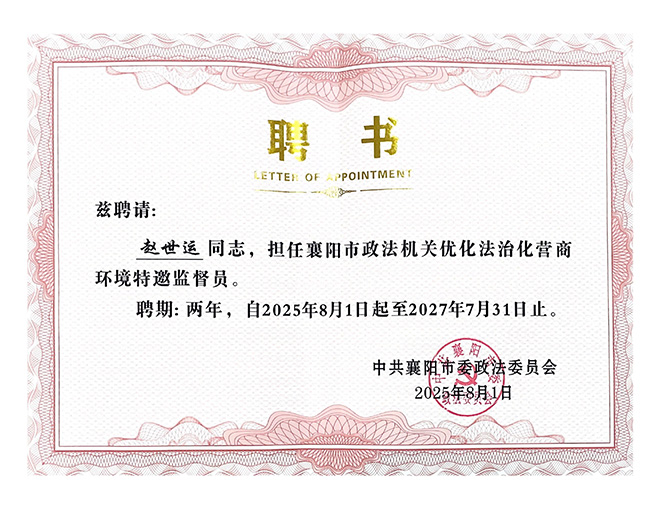 日前,从襄阳市政法委获悉,万洲电气董事长、总经理赵世运被聘为市政法机关优化法治化营商环境特邀监督员。