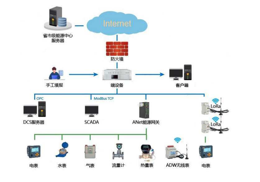 系统可通过Modbus(GB/T19582)、DL/T645、CJ/T188等协议,从现场仪表采集需要的能耗实时数据;可从数据采集器获取数据,通过Modbus TCP(GB/T19582)、MQTT、HTTPS等标准通讯协议从数据采集器获取能耗实时数据;可从自动化信息系统获取数据,通过OPC协议从重点用能单位的自动化信息系统采集需要的能耗实时数据。