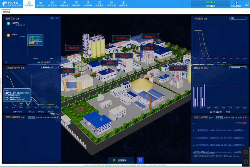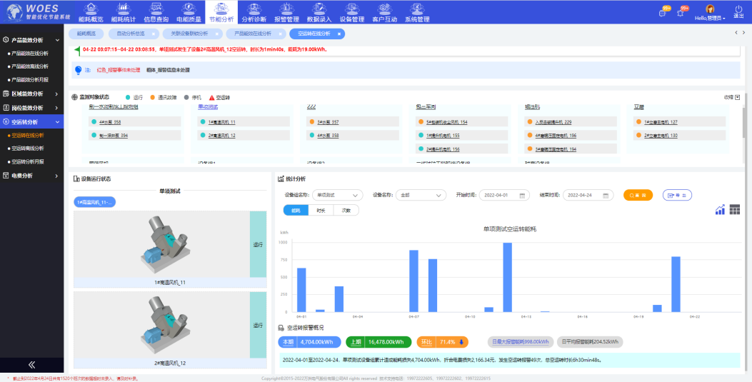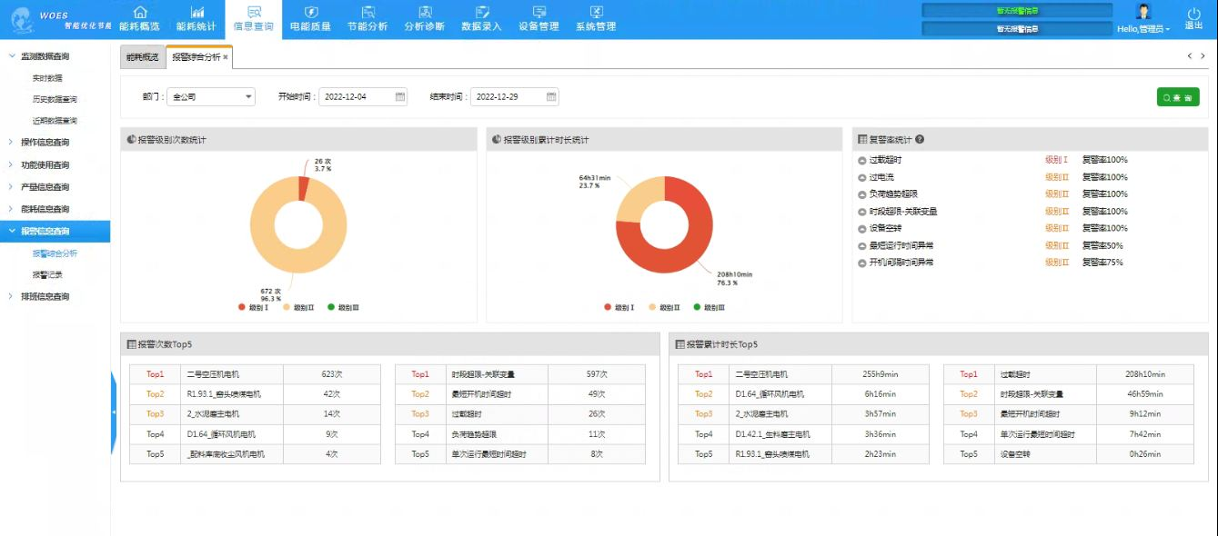 4、关联设备运行节能。现场有两台包装机与收尘机,通过关联设备联锁分析模块发现1#、2#包装机停机后,收尘器没有及时停机,仍然以18.7kW运行功率在运行,造成能耗浪费,通过报警设置对出现的运行异常现象进行推送,加强生产考核管理,每年可节约电费3万元。生料主磨机停机后,低压油泵与高压泵电机存在空转运行的情况,存在长时间空转浪费问题,通过报警设置对出现的运行异常现象进行推送,加强生产考核管理,每年可节约电费1.5万元。