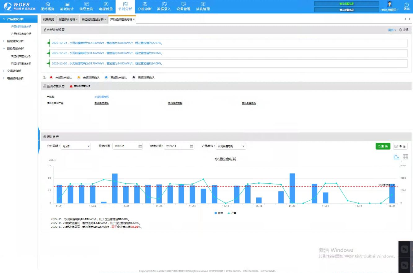 5、单耗、产量关联分析节能。通过产品能效分析发现生料工区单耗存在异常情况;将能耗异常告知用户后,并指导用户通过系统发现份生料磨主电机、循环风机电机运行负荷均高于额定负荷的80%,且单耗均处于16.60-18.9kwh/t之间,合理调整生料磨主电机、循环风机负荷比例,保证负荷率处于75%~80%之间,生料工区单耗控制在了16.50kwh/t以内,平均每天减少电量7500-8000kwh,按全年生产100天计算,每年可约电费45万元。